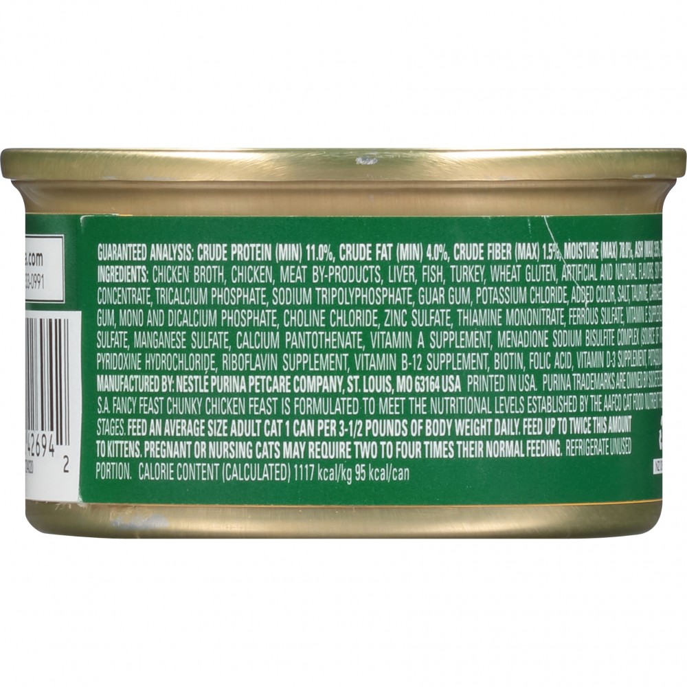 Fancy Feast Chunky Chicken Feast This recipe features tender chunks of chopped chicken feast wrapped in a finely ground pt , sure to delight your cat. Fancy Feast Gourmet Wet Cat Food entres feature all of your cats favorites always prepared with high quality ingredients for an exceptional level of taste.