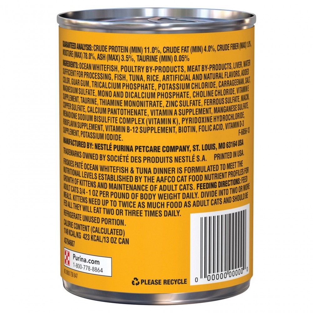 Ingredients: Ocean Whitefish, Poultry By-Products, Meat By-Products, Liver, Water Sufficient for Processing, Fish, Tuna, Rice, Artificial and Natural Flavors, Added Color, Guar Gum, Salt, Potassium Chloride, Carrageenan, Choline Chloride, Taurine, Sodium Tripolyphosphate, Magnesium Sulfate, Thiamine Mononitrate, Ferrous Sulfate, Vitamin E Supplement, Zinc Oxide, Copper Proteinate, Sodium Selenite, Niacin, Manganese Sulfate, D-Calcium Pantothenate, Pyridoxine Hydrochloride, Riboflavin Supplement, Vitamin A Supplement, Biotin, Potassium Iodide, Vitamin D-3 Supplement, Vitamin B-12 Supplement, Folic Acid. E-6056-13.
