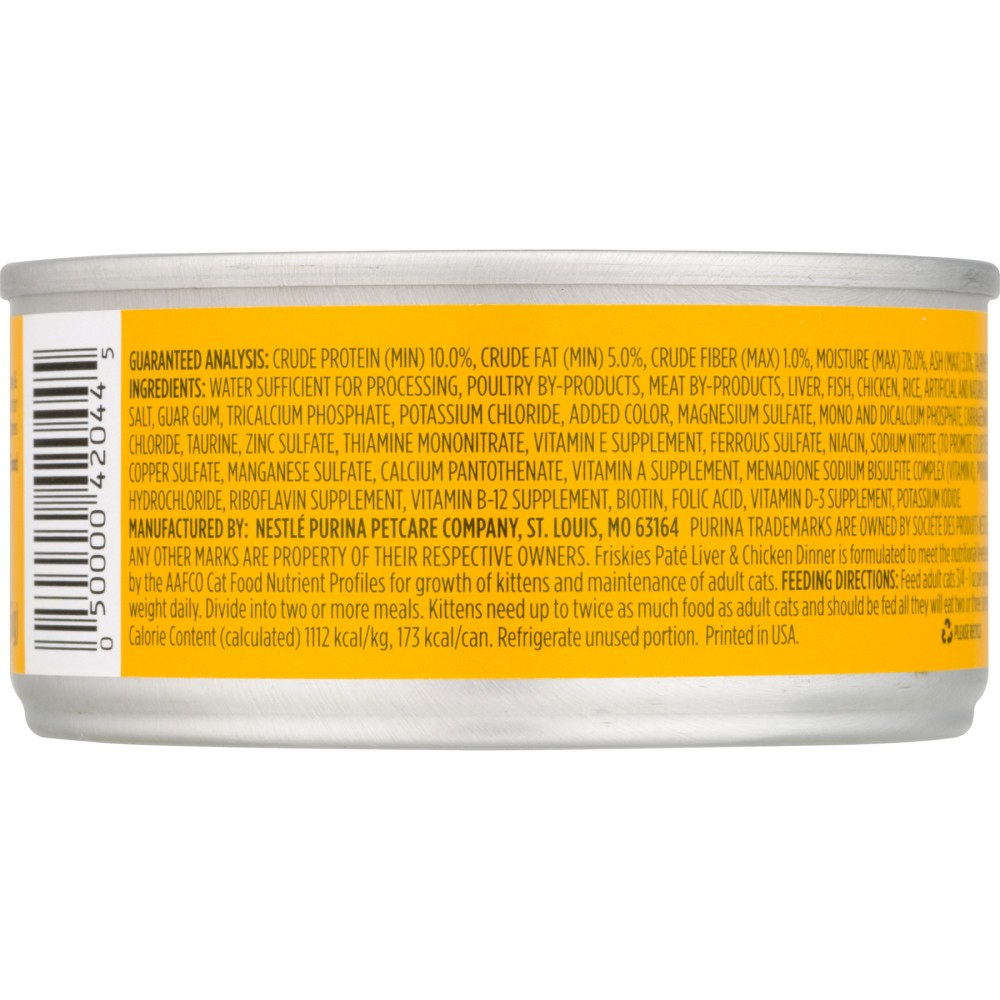 Purina Friskies Pate Liver & Chicken Dinner. It is a 100% complete & balanced nutrition for adult cats & kittens. This product is formulated to meet the nutritional levels established by the AAFCO Cat Food Nutrient Profiles for growth of kittens and maintenance of adult cats.
