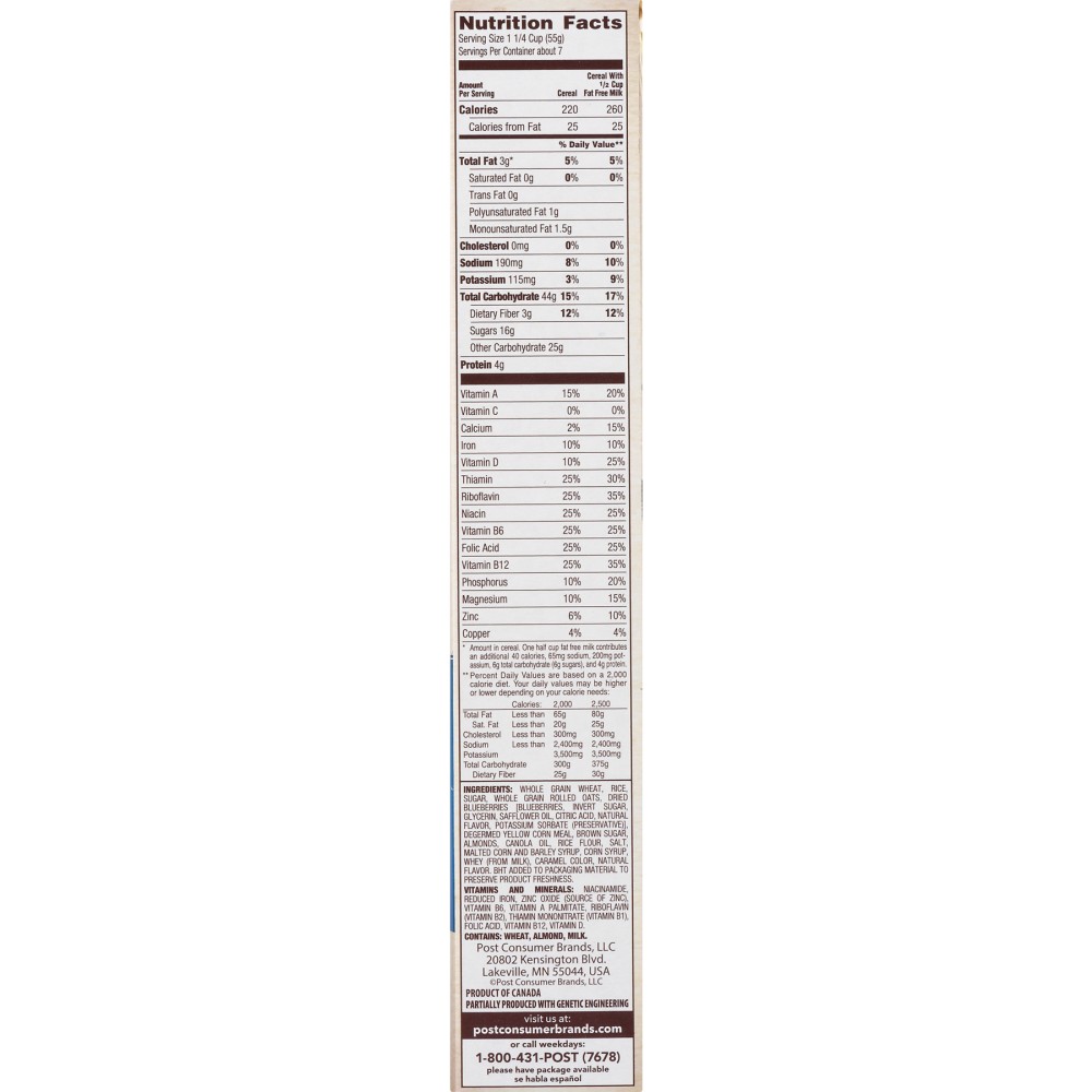 Rice, sugar, dried blueberries [blueberries, high fructose corn syrup, glycerol, safflower oil, citric acid, potassium sorbate (preservative), natural flavor], whole grain rolled oats, whole grain wheat, degermed yellow corn meal, brown sugar, high oleic vegetable oil (canola or sunflower oil), almonds, rice flour, salt, malted corn and barley syrup, corn syrup, whey (from milk), caramel color, artificial flavor, natural flavor, bht added to pack