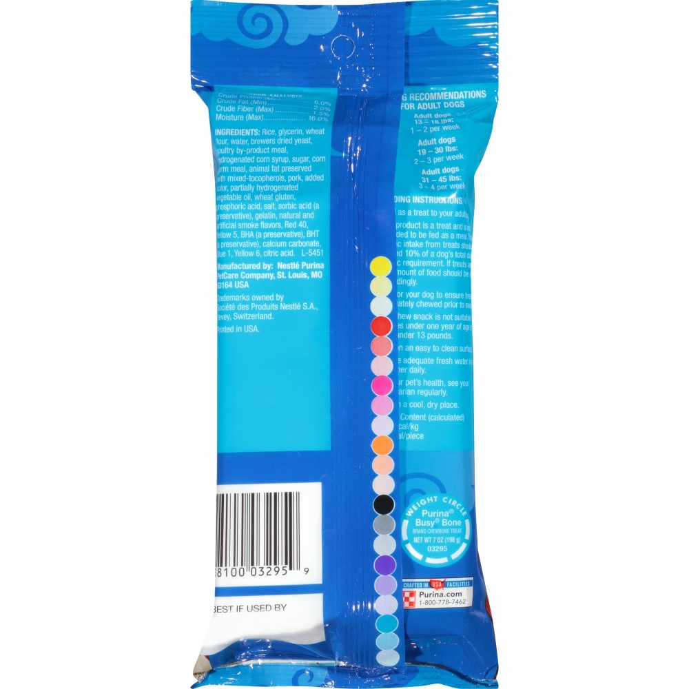 Instructions: Feeding Recommendations For Large Dogs Adult Dogs 25 to 50 Lbs: 1 to 2 Per Week Adult Dogs 51 to 100 Lbs: 2 to 4 Per Week Adult Dogs Over 100 Lbs: 4 to 5 Per Week Store In A Cool, Dry Place This Chew Snack Is Not Suitable For Puppies Or Toy Breeds. Busy Bone Is A Treat Or Snack and Is Not Intended to Replace Your Pet's Main Meal. Provide Fresh Water For Your Dog Daily.