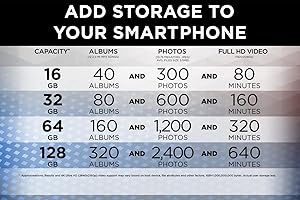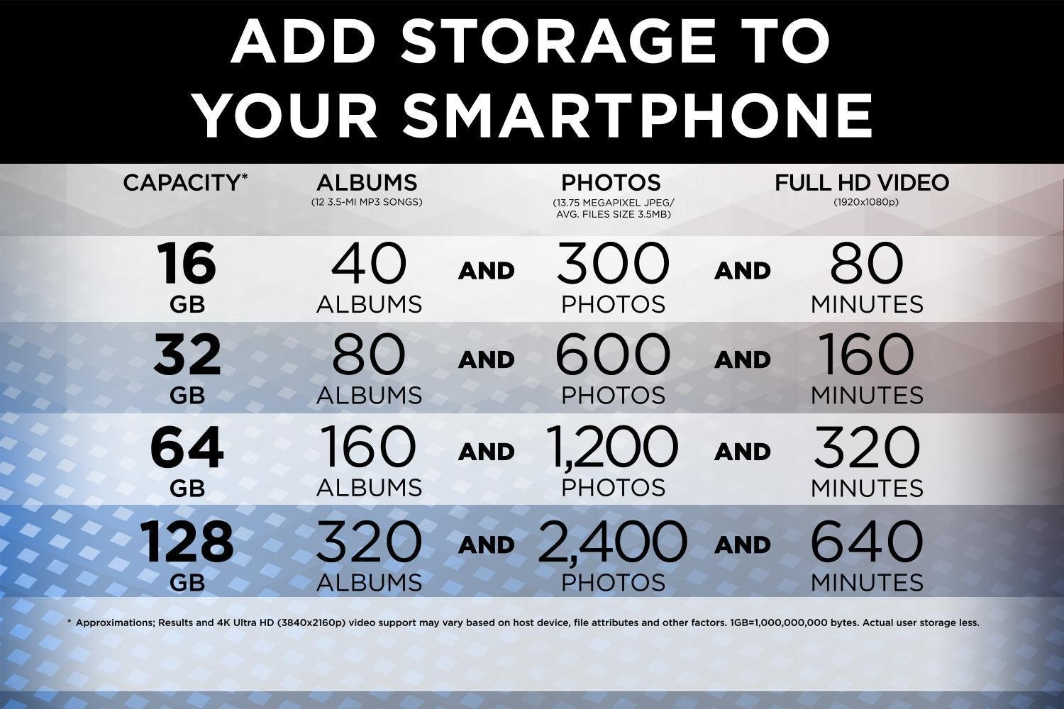 SanDisk Memory Zone App for Easy File ManagementAvailable from the Google Play store, the SanDisk Memory Zone app lets you view, access, and back up all the files from your phone's memory in one location (4). It can also automatically move files from your device to your card to free up space. | Durable Design for Use in Extreme EnvironmentsSanDisk Ultra microSDXC UHS-I Cards are shockproof, temperature-proof, waterproof, and X-ray-proof (3), so you can enjoy your adventures without worrying about the durability of your memory card. | Choose the Amount of Storage You NeedThe amount of capacity you need depends on the types of files you have, how big they are, and how many there are. The chart above gives you an idea of how many photos and hours of video you can store for each capacity. |