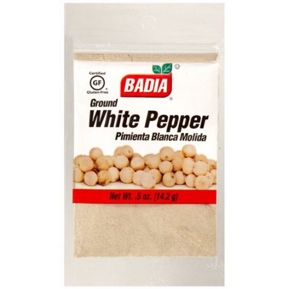 Badia Ground White Pepper, 0.5 Oz (Pack of 12)Certified gluten-free. White pepper is the result of a process which includes the elimination of the outer shell of a red berry, giving the pepper a more refined flavor and a more discrete appearance. Visit our website www.badiaspices.com. Please recycle! Packed in the USA.